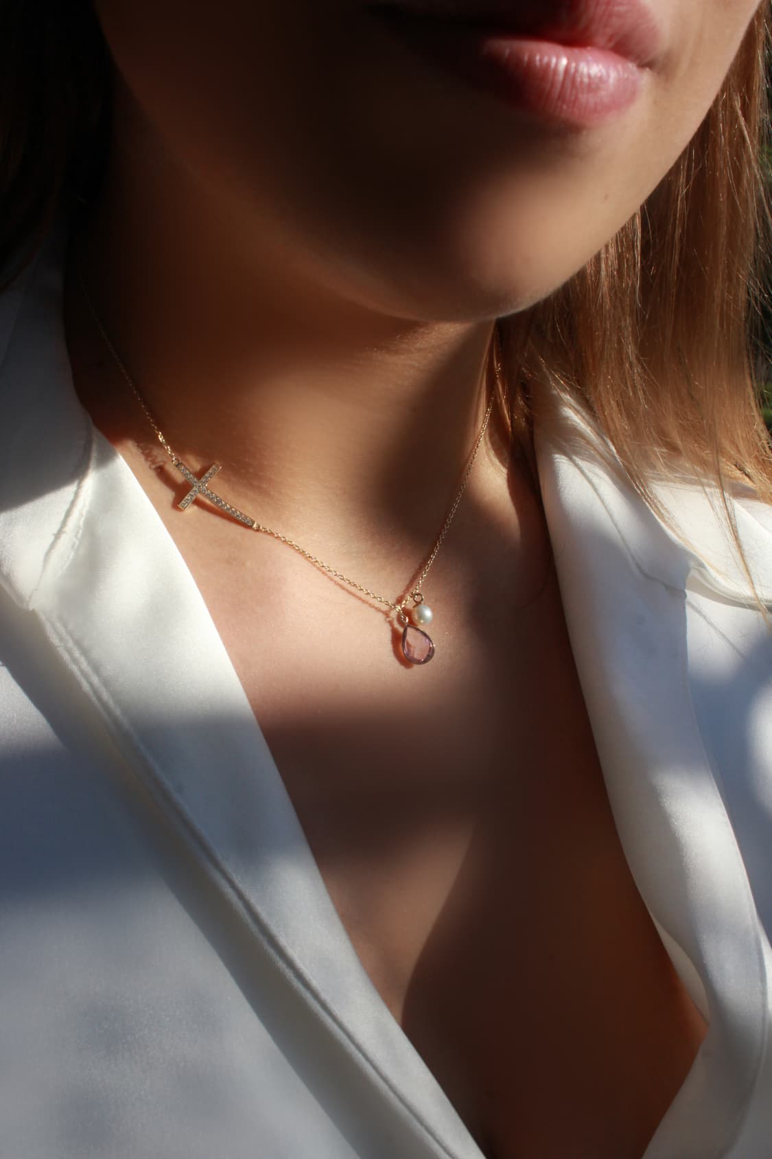 Das seitliche Goldkreuz wurde mit funkelnden Zirkonia-Steinen besetzt und ist ein modisches Trendstück.