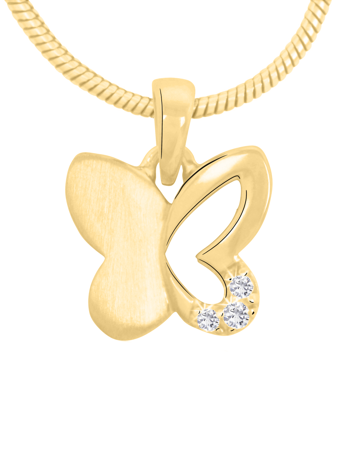 Goldener Schmetterlinganhänger in echtem Gelbgold und drei glitzernden Zirkonia. Gold, wie wir es lieben!